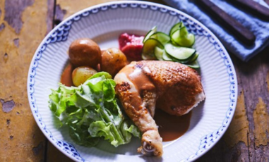 1/2 stegt kylling serveret med hvide kartofler vendt i frisk persille, skysauce, rabarberkompot, hjemmesyltet argurkesalat samt grønt salat med dressing.
